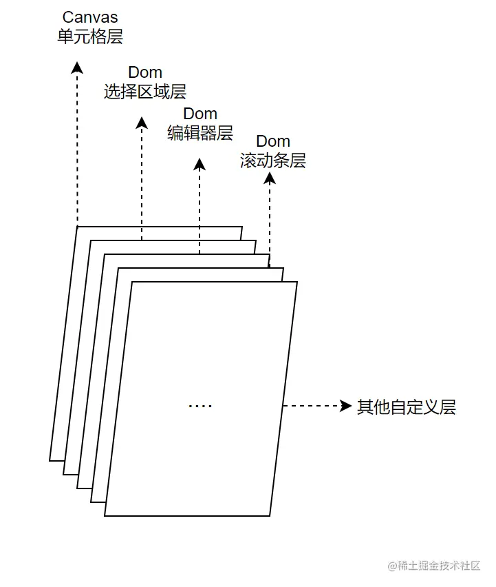 - 不同的操作会有自己独立的层,这些操作改动最终会落到最底层的Canvas层单元格上面。