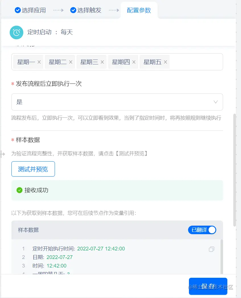 我们选择好定时启动的触发及触发条件,在配置参数中可以设置定时发送的内容及发送时间,定时向企微群发送通知和提醒,定时收集各社交媒体平台的运营数据。