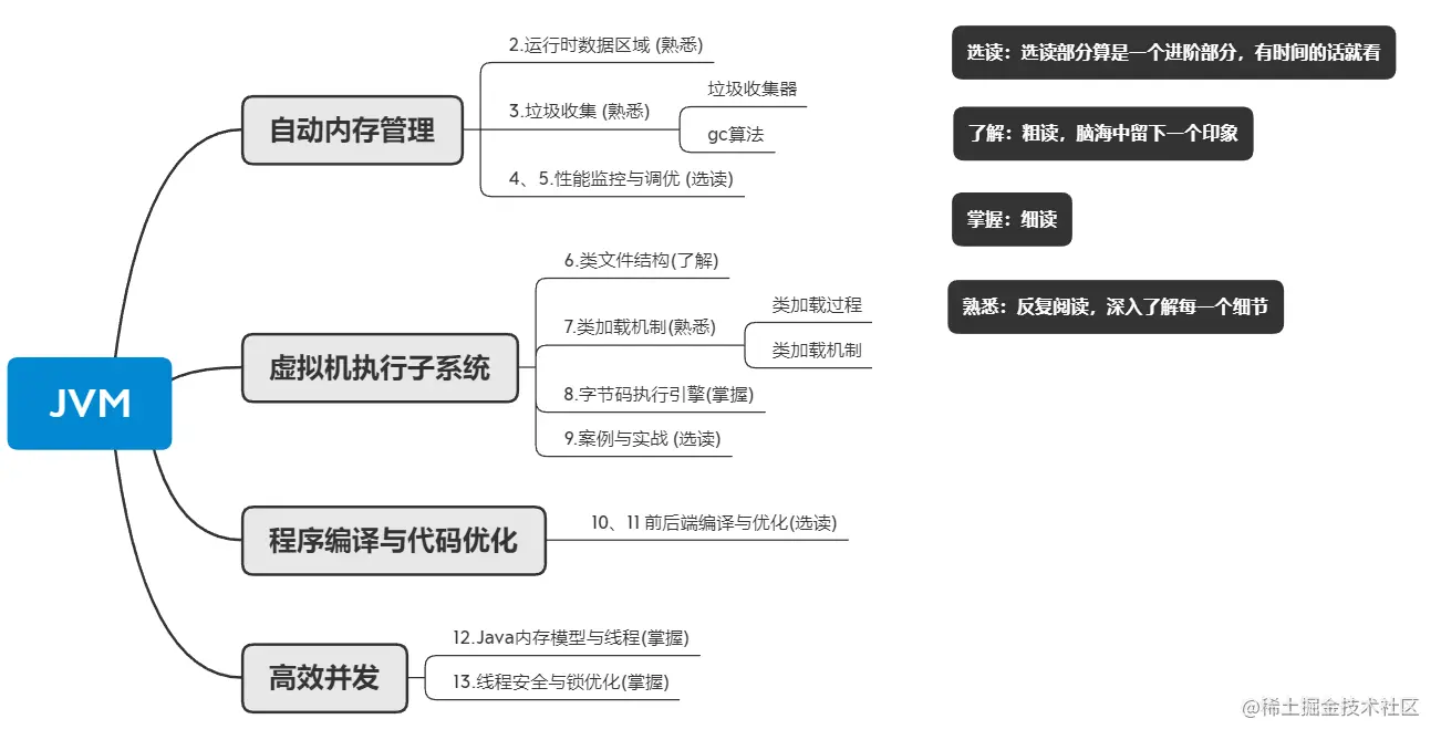 掌握: 掌握部分是第八章的字节码执行引擎以及十二、十三章的并发部分。第八章的字节码分析,是比JVM调优稍微简单点的面试加分项,书中的分析也十分到位,作者几乎已经把知识给你嚼碎了,只差你自己送到胃里,所以把整个部分归纳为了掌握。至于十二和十三章,如果对Java并发编程有过学习推荐仔细阅读,会有不一样的收获。但如果备战学习的过程中还没有进行并发编程的学习,那么这两章可以先放一放,暂时不看,在Java并发编程的学习体系中更系统的去学习会更好。