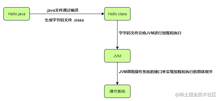 详细点说,JVM内部实现了内存管理,例如JVM能够给我们Java代码中的对象进行内存分配、当对象没用的时候进行垃圾回收。而内存是我们操作系统的东西,所以JVM就相当于一个中间调度者,我们的Java代码编译生成字节码,字节码交给JVM,JVM调用操作系统的东西来实现代码的运行。过程如下图所示