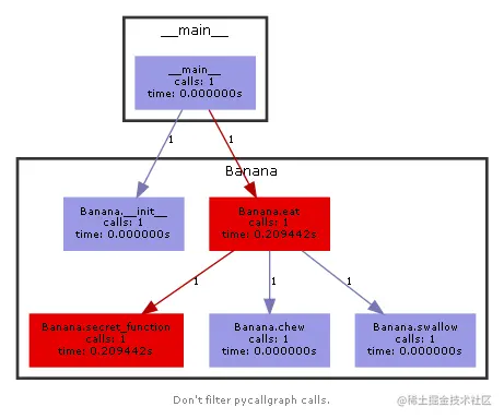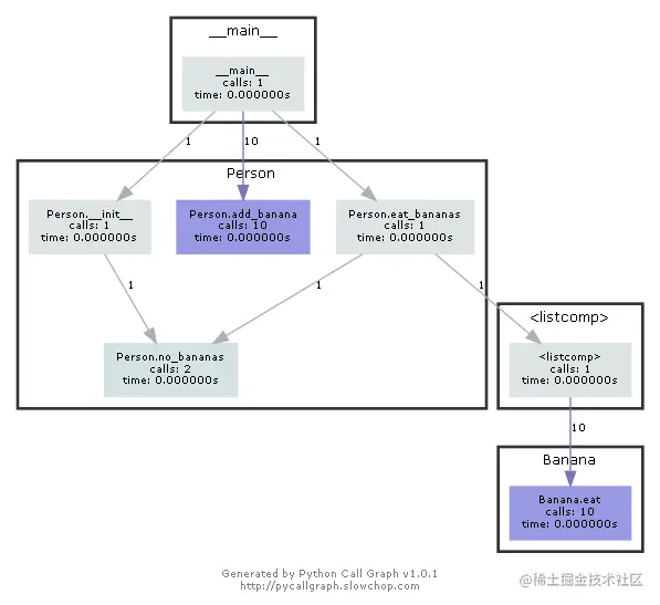 代码比较简单,定义了两个简单类,主要 pycallgraph 的核心代码在 main 函数中,在 with 代码块下,把我们定义的代码执行一遍即可