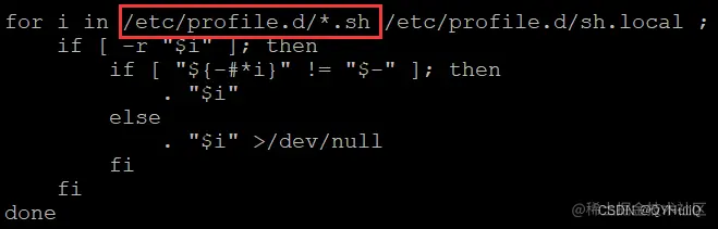 以往我们添加环境变量时,是直接在/etc/profile文件中修改的,但是这次我们尝试用另一种方式来配置环境变量。因为我们认真阅读/etc/profile中的代码可以发现如下这段代码中会遍历/etc/profile.d下面的所有.sh文件执行循环体中的操作,使各个sh文件中的环境变量全局生效,所以我们可以直接在/etc/profile.d目录下创建一个sh文件去单独配置我们的环境变量。这种做法是目前在企业中较为常用的。