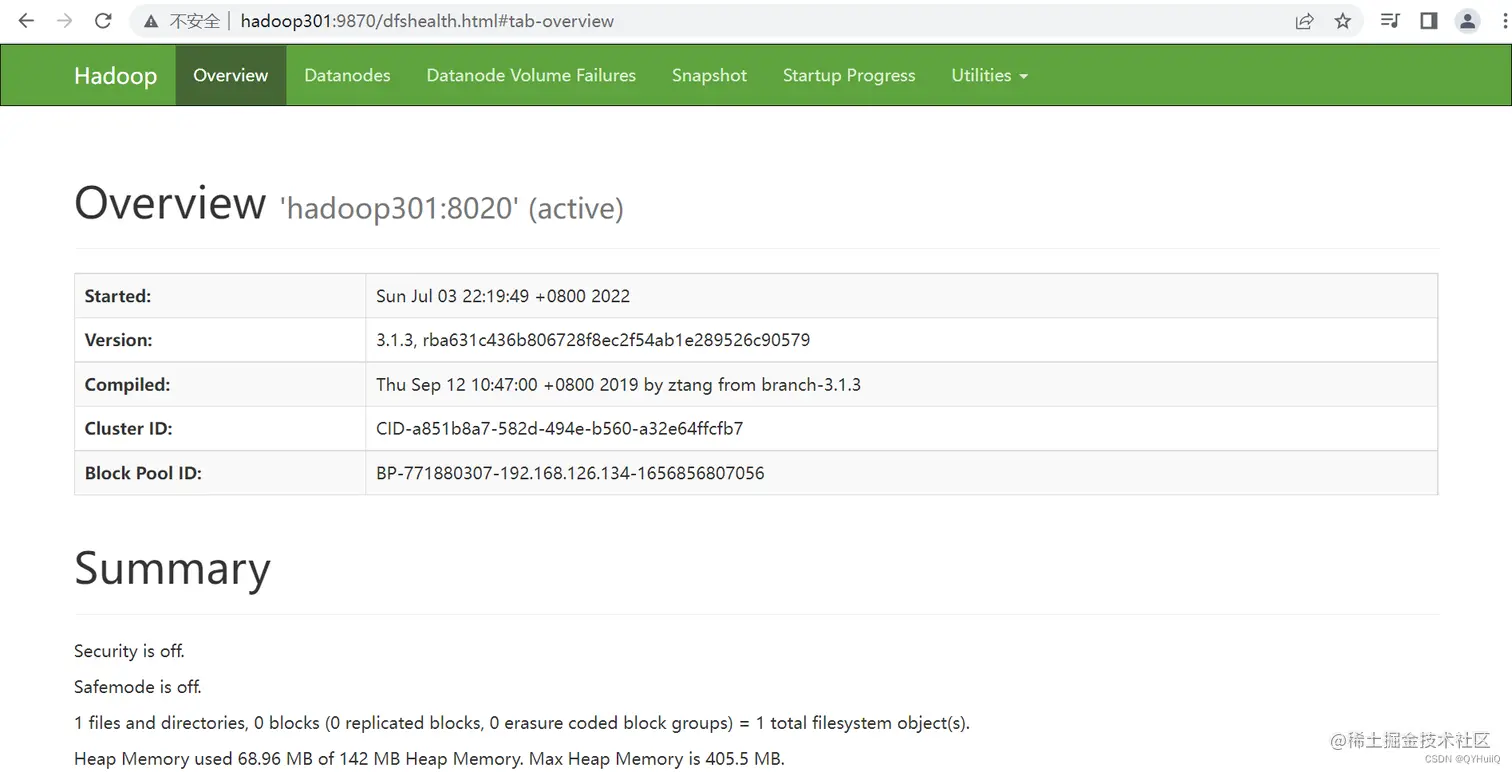 启动成功后,可以访问NameNode的web界面(访问地址就是刚才我们在hdfs-site.xml中配置的):