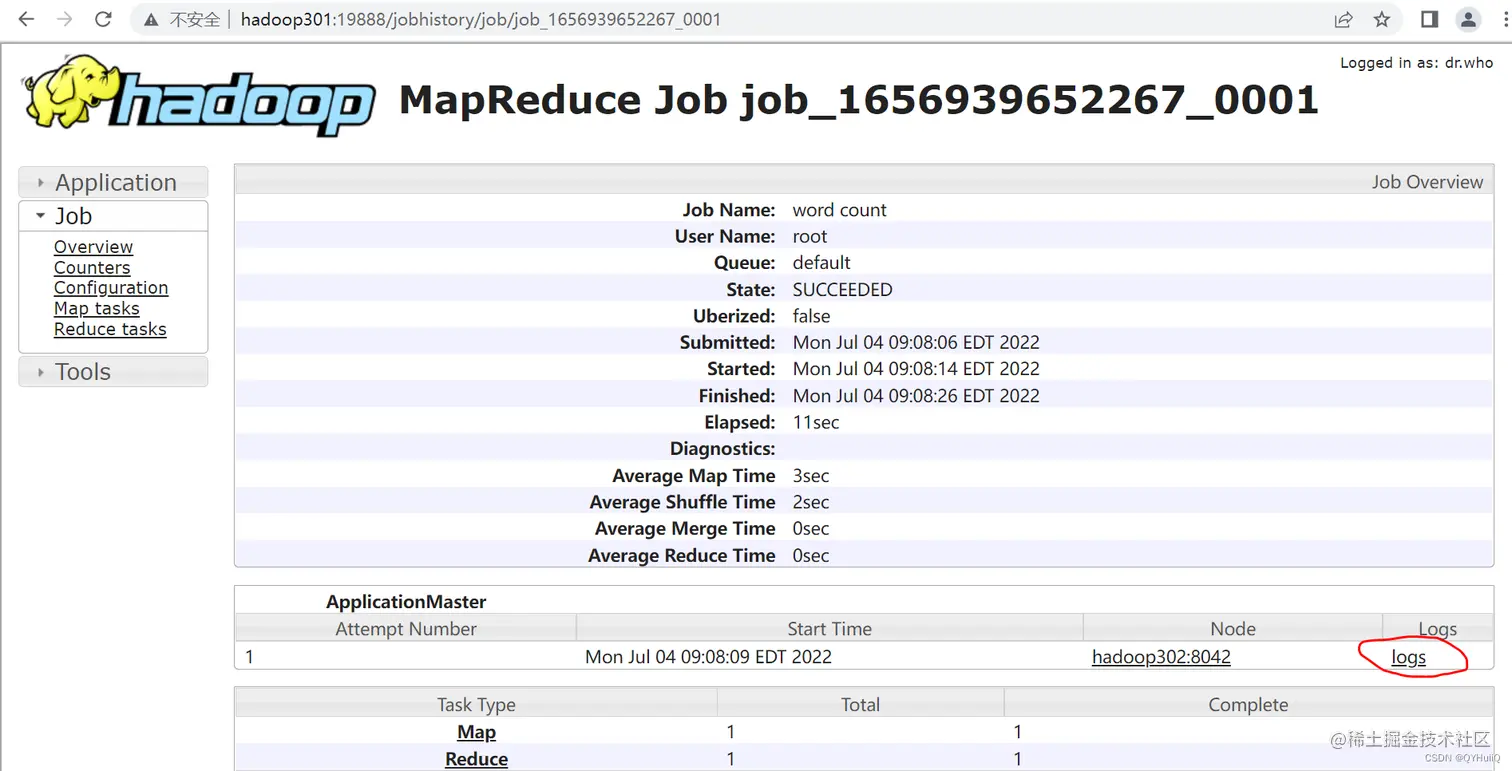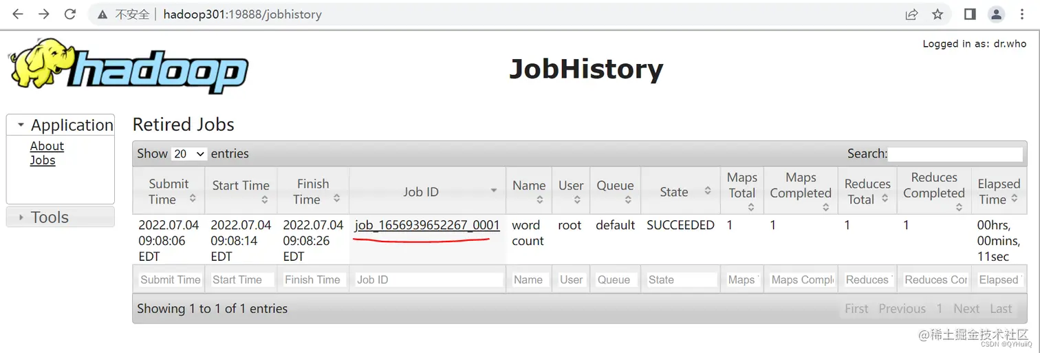 由于mapred-site.xml中配置的是hadoop301作为历史服务器,所以这里在hadoop301上启动: