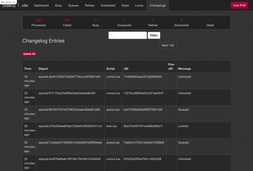 它将包括原始的Sidekiq客户端,但它也会给你提供两个页面--一个是作业锁,另一个是变更日志。这就是它的样子: