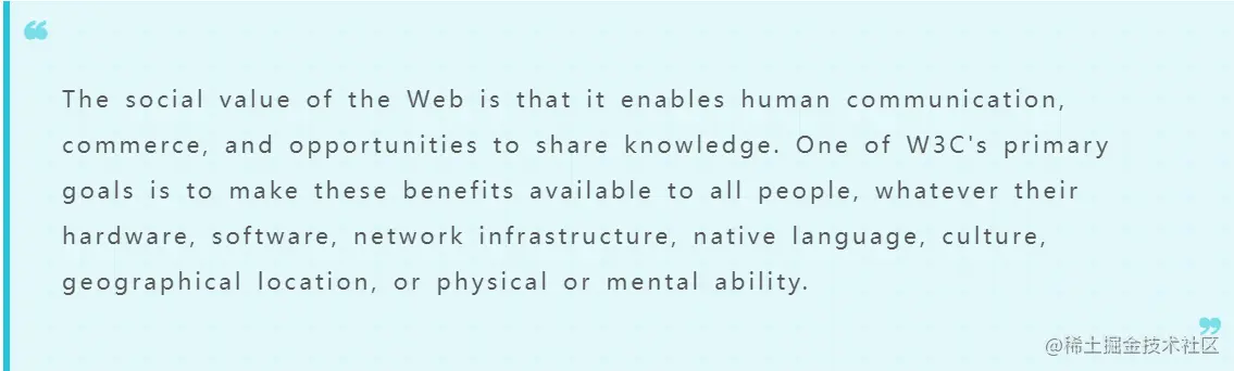 Web 的社会价值在于它使人类交流、商业和分享知识的机会成为可能。W3C 的主要目标之一是让所有人都能获得这些好处,无论他们的硬件、软件、网络基础设施、母语、文化、地理位置或身体或精神能力如何。