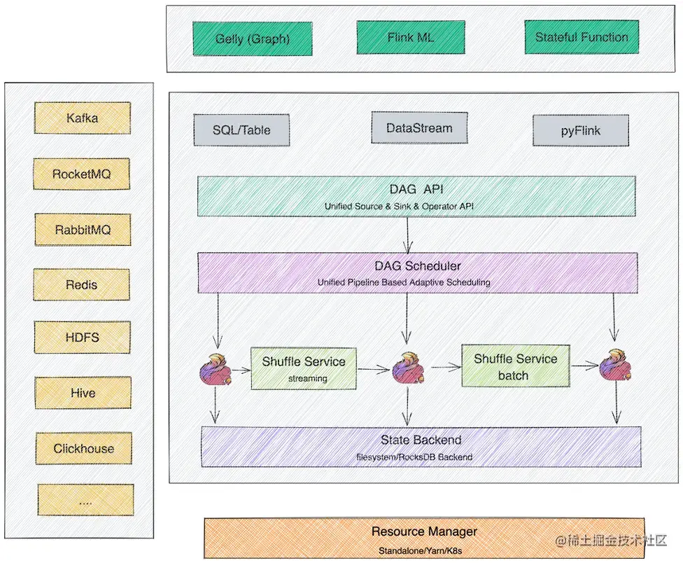 - 执行引擎层(Runtime层):执行引擎层提供了统一的DAG,用来描述数据处理的Pipeline,不管是流还是批,都会转化为DAG图,调度层再把DAG转化为分布式环境下的Task,Task之间通过Shuffle传输数据;
