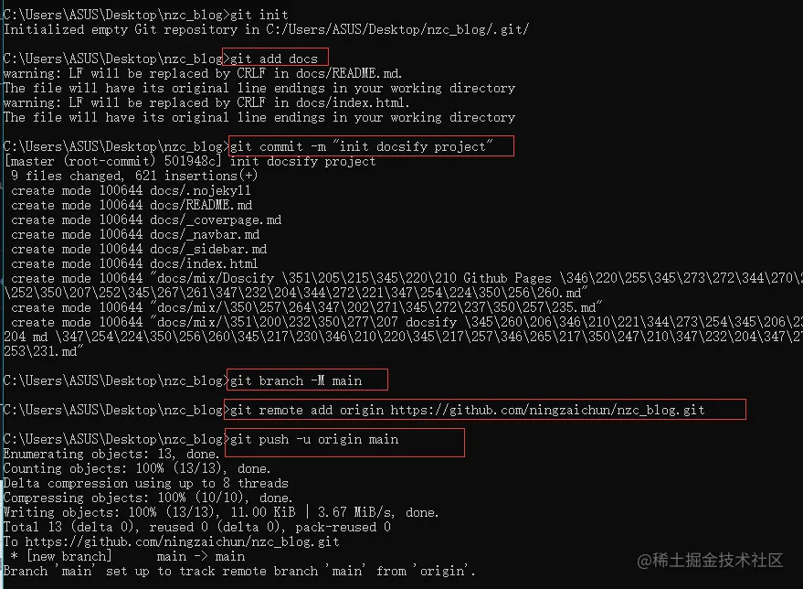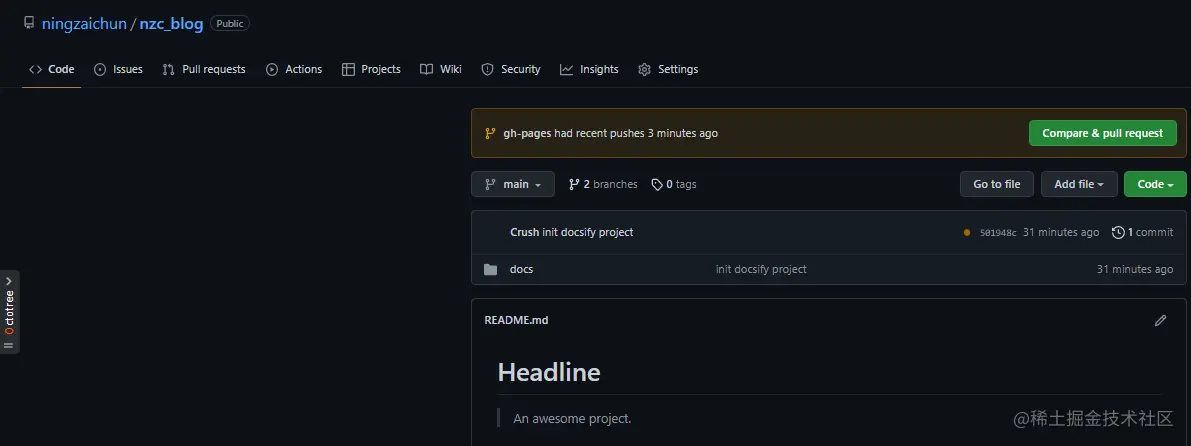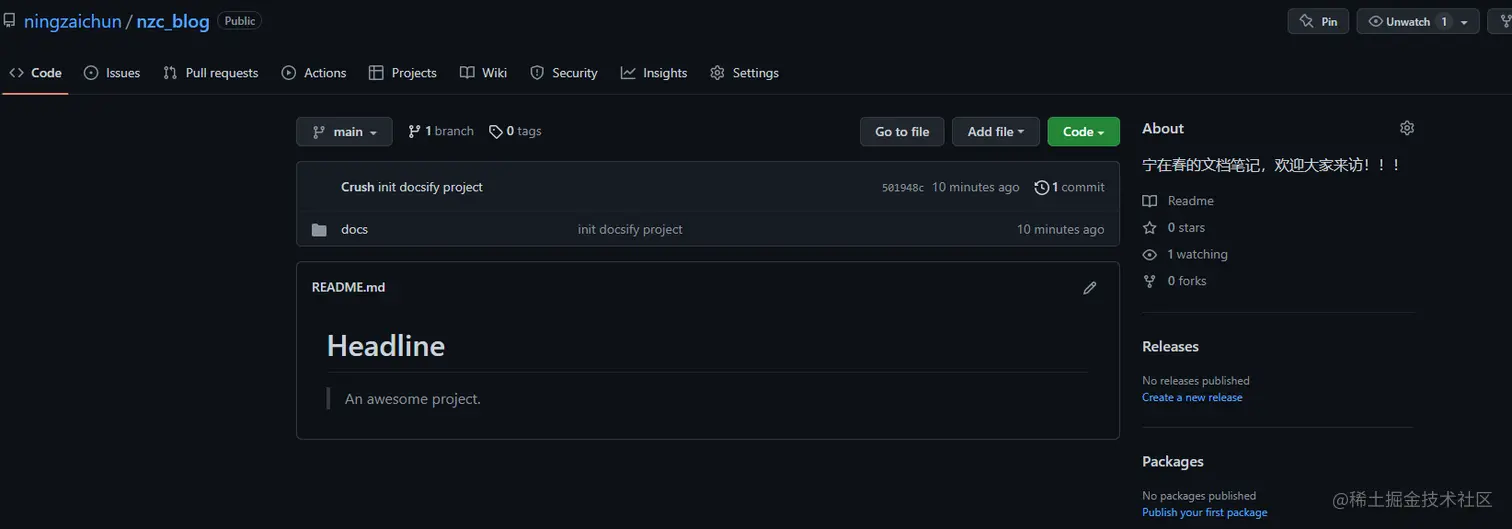 将我们本地的 docsify 初始化的项目及写好的文章等,push 至 github 仓库。