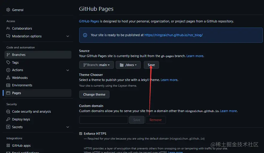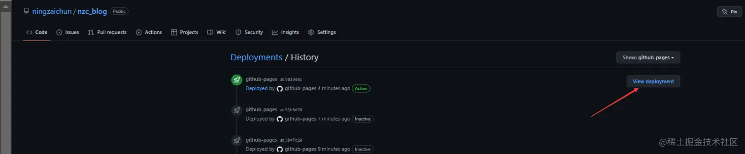 gh-pages 已经在五分钟前 push 了.当我框起来的那个地方,变成 active就表示已经部署完成,可以进行访问了.