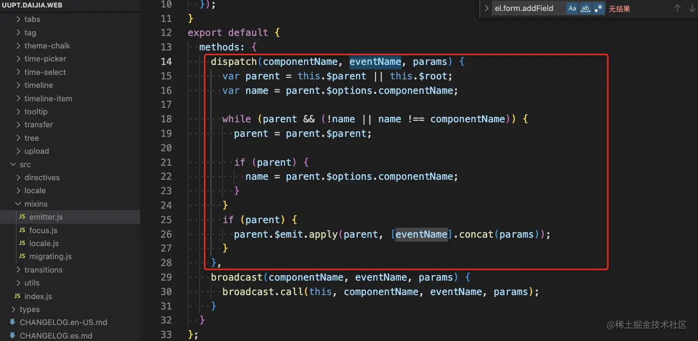 dispatch方法在src-mixins-emitter.js中,主要是通过向上查找的方式,找到对应的组件,然后利用vue的emit事件传递一个方法,方法可带上参数。