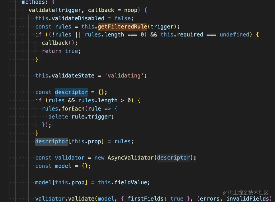 首先通过getFilteredRule获取到当前表单元素的rules,可以看下在getRules中,通过收集form上绑定的rules 和 form-item绑定的rules合成一个数组。这个数组就是用来存储校验规则的。