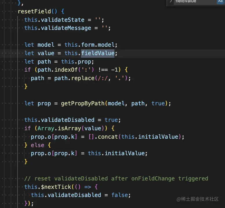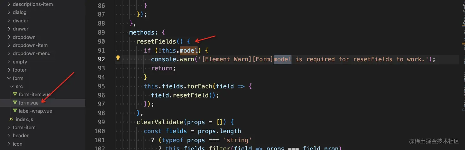 在form.vue中 总共有两处用到了model对象,一个是resetFields这个方法