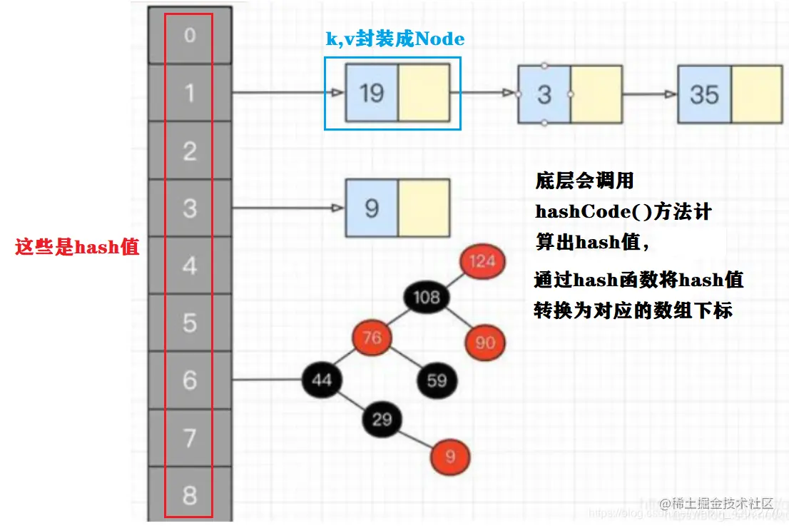 HashMap的结构是散列表+链表,如下: