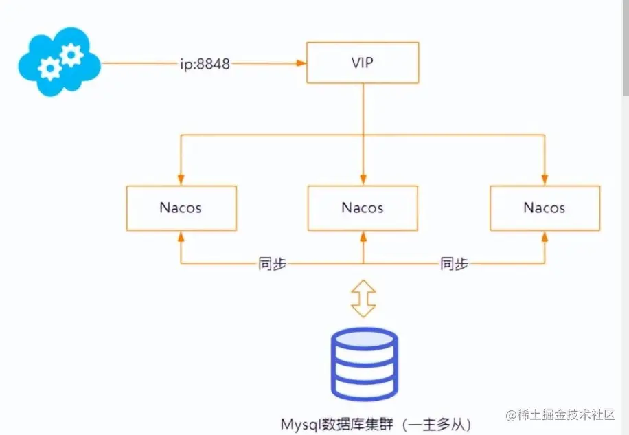 Nacos作为配置中心的集群结构中,是一种无中心化节点的设计,由于没有主从节点,也没有选举机制,所以为了能够实现热备,就需要增加虚拟IP(VIP)。