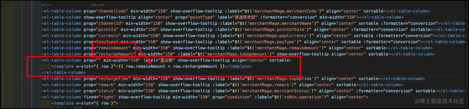 <el-table-column prop="" min-width="150" label="总金额" show-overflow-tooltip align="center" sortable> <template slot-scope="{ row }">{{ row.remainAmount + row.rechargeAmount }}</template> </el-table-column>