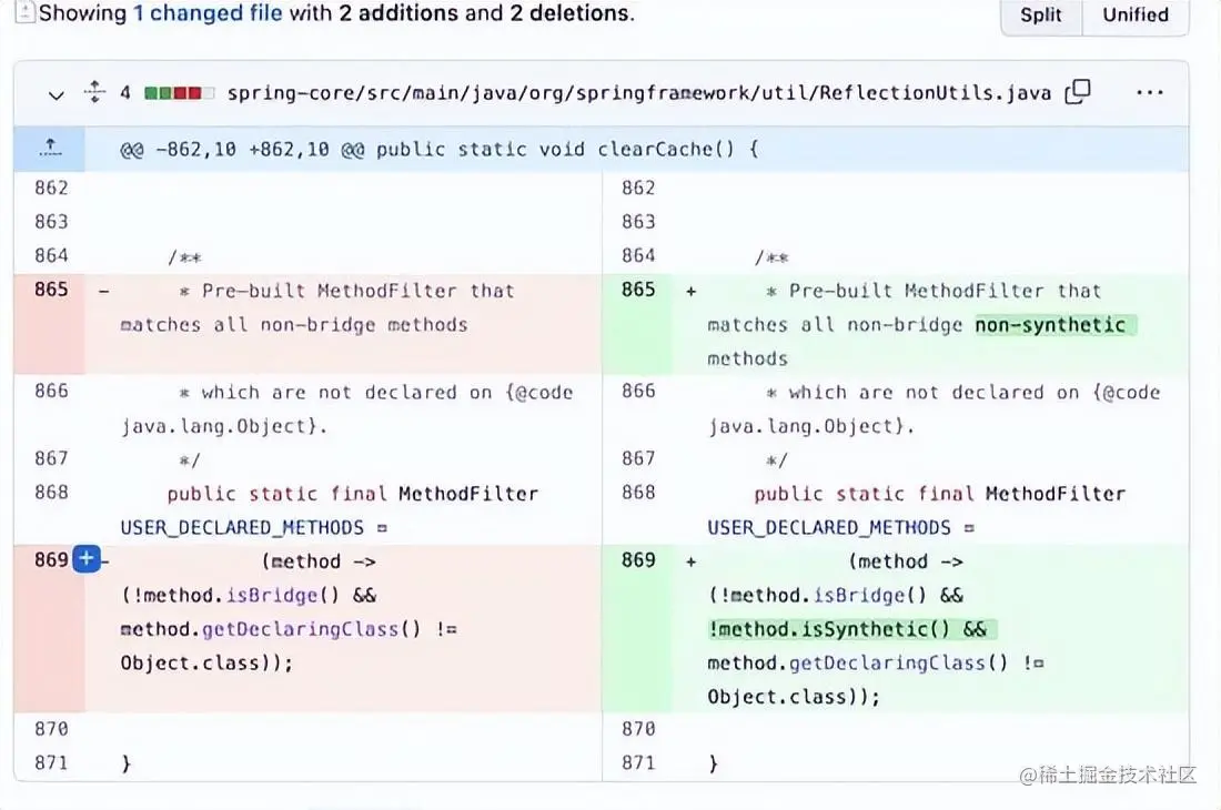 那这么严重的问题,难道 kotlin 不解决吗?是的,kotlin 不解决,那就只能上层框架兼容了,Spring 在后续的版本中做了修复,增加了对 ACC_SYNTHETIC 的判断,修改的地方如下: