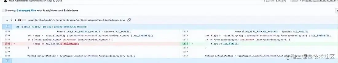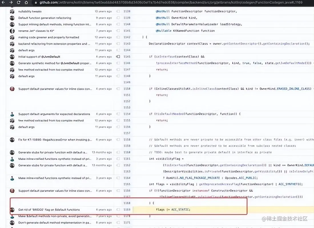 有了实验的结果,反过来寻找原因就很简单了,找到原因 kotlin 1.2 的源码,然后翻一翻源码,马上找到了对应的逻辑。在 4 年前的一个 commit 中,有一个伙计干掉了 ACC_BRIDGE 标记。