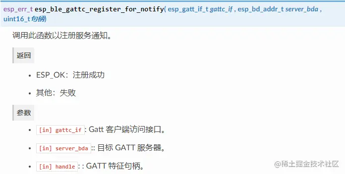 这个过程向BLE堆栈注册通知,并触发ESP_GATTC_REG_FOR_NOTIFY_EVT事件。此事件用于写入服务器客户端配置描述符: