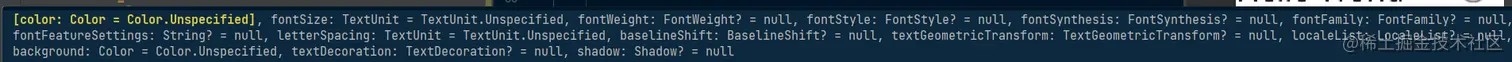 从构造方法来看,SpanStyle其实和Text的构造方法差不多,而且比Text类中的属性都要丰富,如设置背景色,阴影等(而Text类中这些功能都被封装在Modified类里)