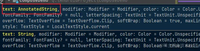 但在Compose中,我们可以很方便的实现上述这样的效果,text属性除了接收字符串,还可以接收一个参数AnnotatedString,如下图所示