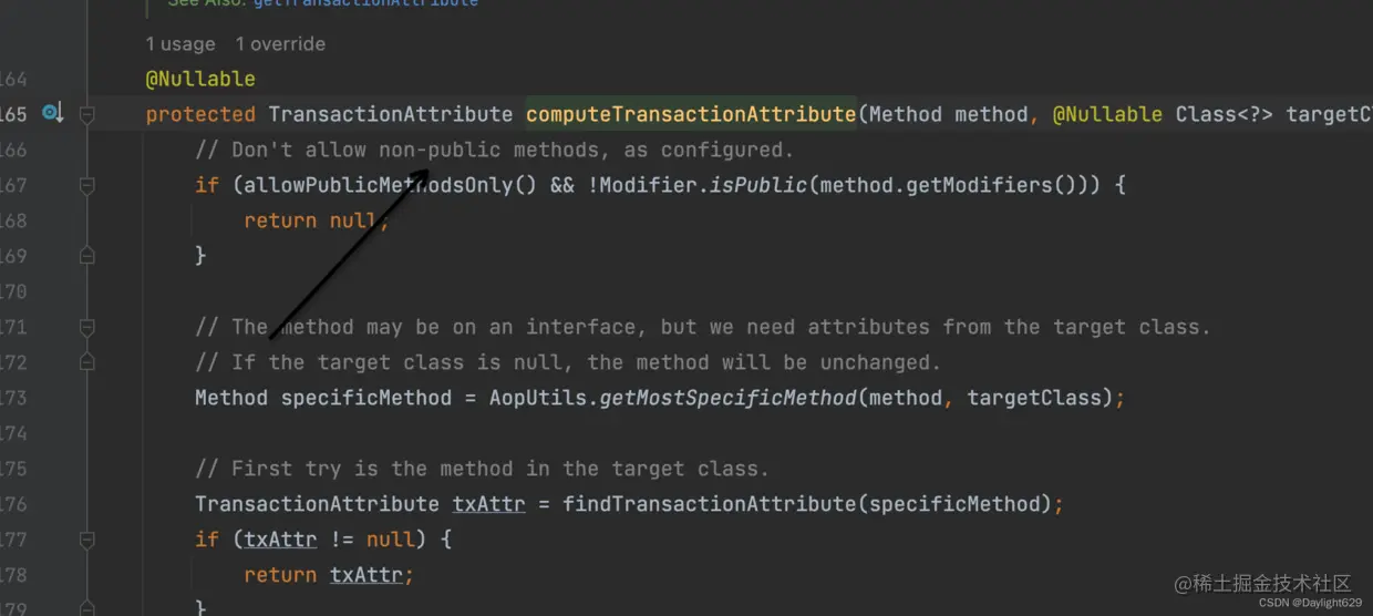我们可以查看源码,可以明白,spring事务的实现AbstractFallbackTransactionAttributeSource类的computeTransactionAttribute方法中有个判断,如果目标方法不是public,则TransactionAttribute返回null,即不支持事务。