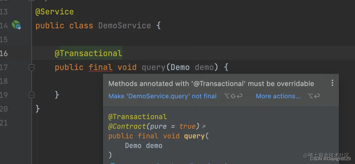 我们在学习的时候都知道,某个方法不想被子类继承的时候就会加上关键字final,这种写法正常来说是没有问题的,但是如果该方法被用上事务就不行了