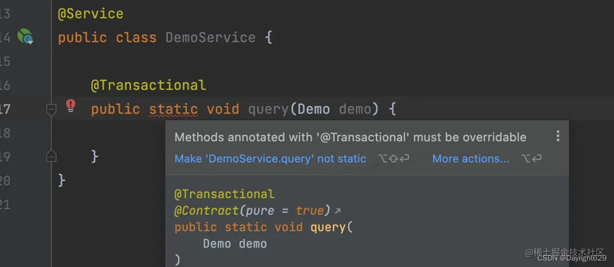 我们可以看到query的事务传播设置为了Propagation.NEVER,这种类型的传播不支持事务,会抛异常,