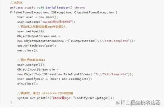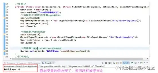 下面这个例子,主要是在对静态变量序列化之后,然后更改静态变量age的值,再重新反序列化输出一下。结果会出现两种情况: