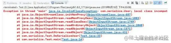 接着我们更改serialVersionUID = 123456789L。然后再反序列化,就可以看到如下的错误了。同时也验证了序列化和反序列化需要版本一致的问题。