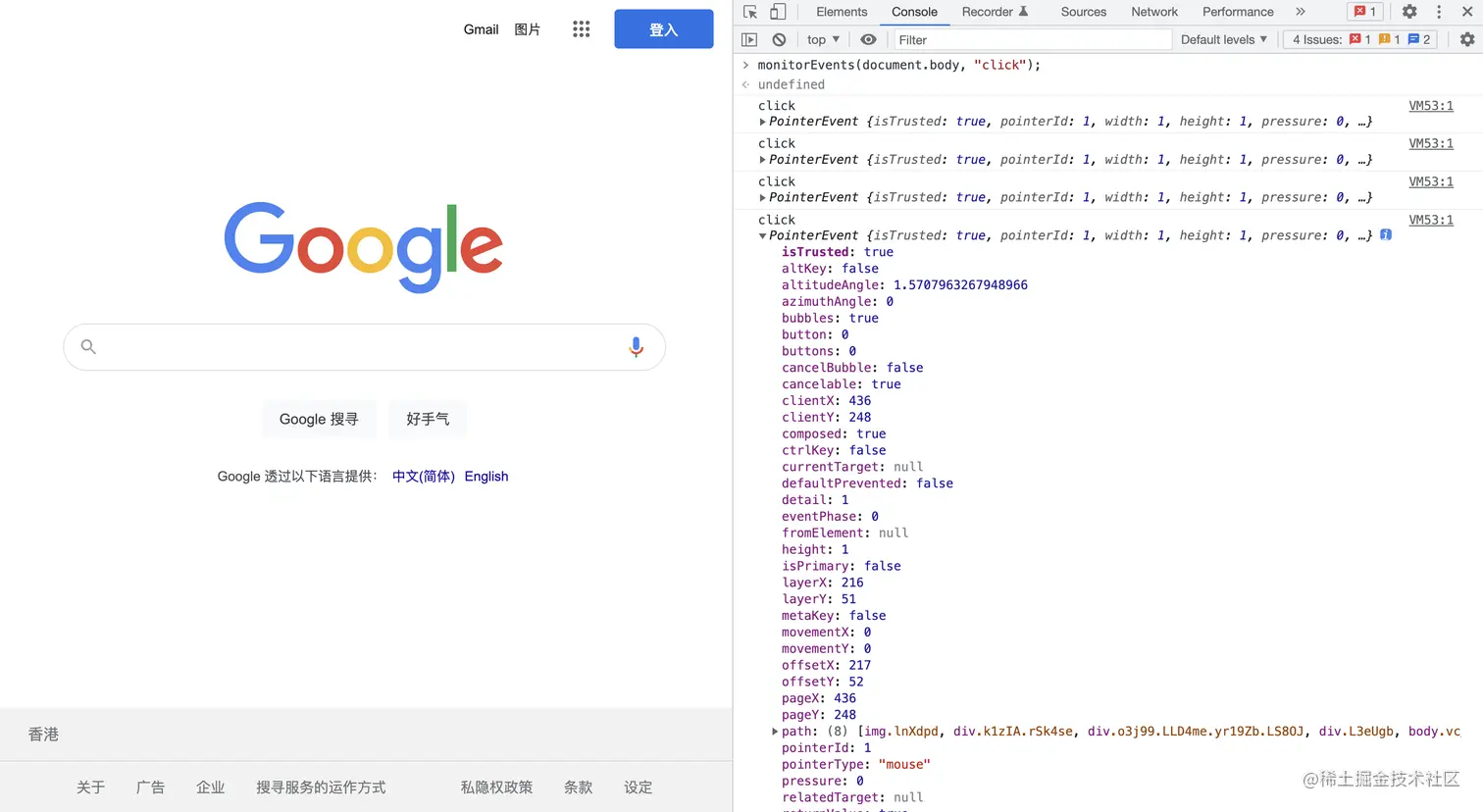 可以在 Chrome Devtools 的 Console 面板中输入 monitorEvents() 来监听指定目标事件的信息。该方法有两个参数,第一个参数是要监听的对象。如果未提供第二个参数,所有事件都会返回。要指定要监听的事件,传递一个字符串或字符串数组作为第二个参数。