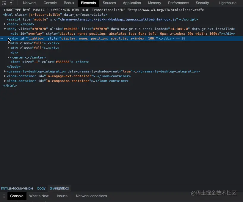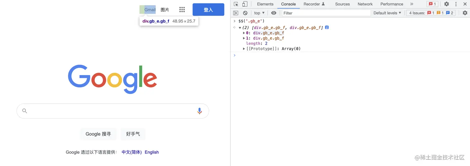 在 Chrome DevTools 的 Console 面板中,可以输入一些带 $ 的命令来选择和检查 DOM 元素。