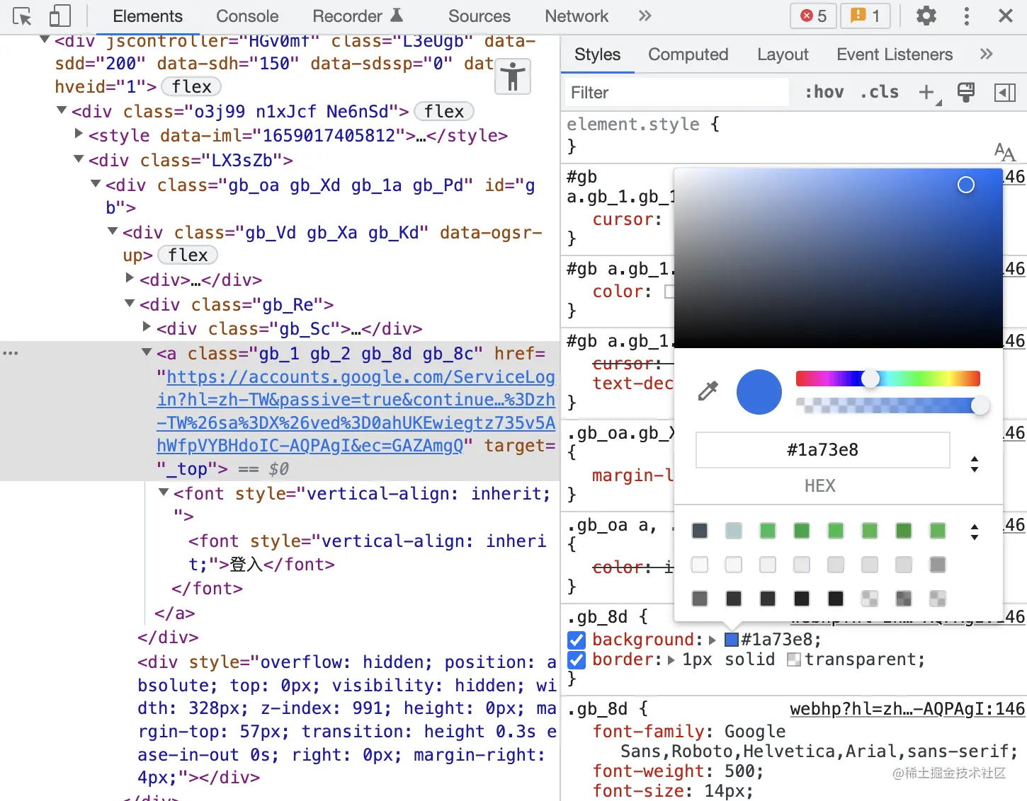 Chrome DevTools 提供了一个颜色选择器来设置背景颜色和文本颜色。颜色选择器具有各种功能: 颜色选择器具有各种功能,例如