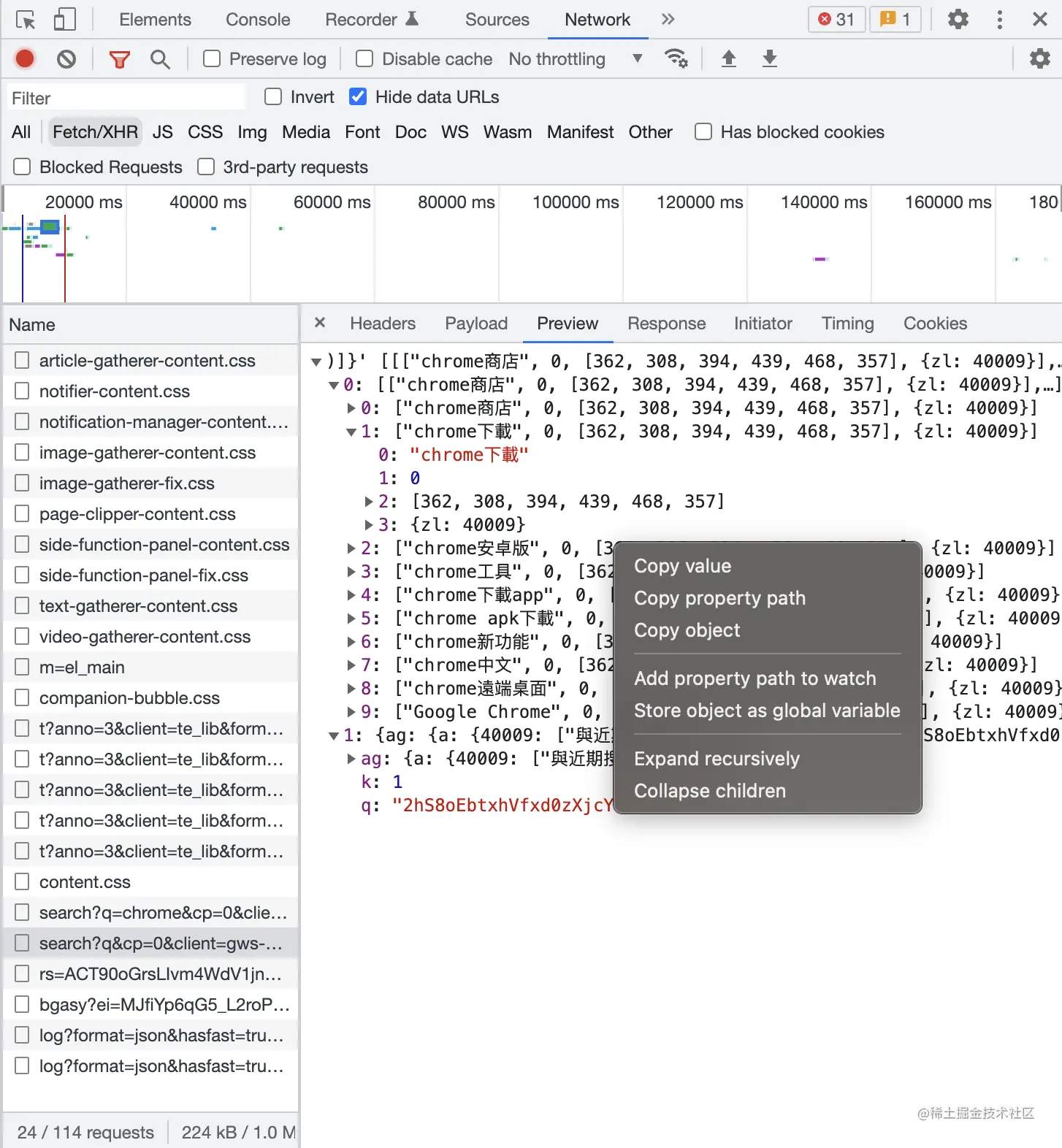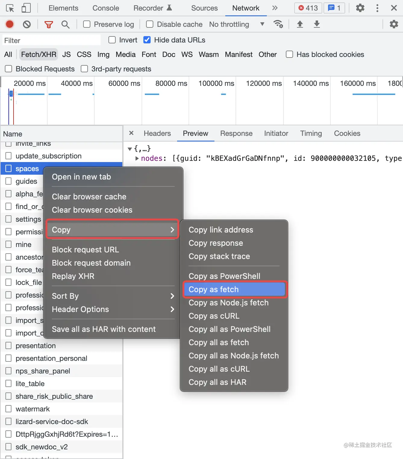 对于一个请求,有时需要修改请求参数并重新发送,可以直接在控制台发送请求。只需要先右键点击需要重新发送的 XHR 请求,选择 Copy -> Copy as fetch: