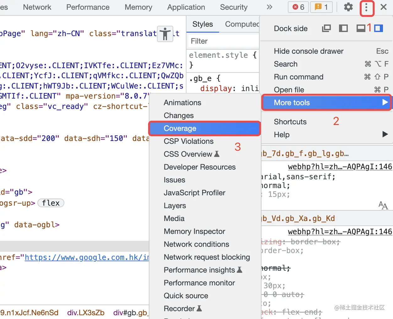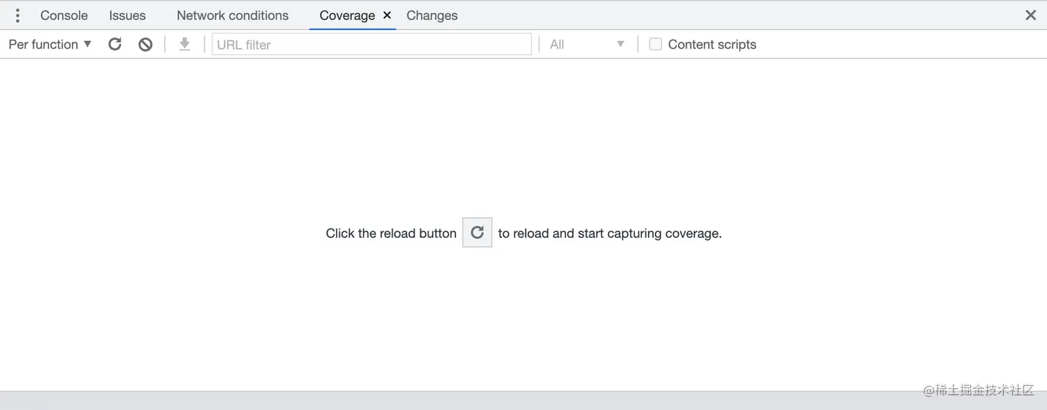 可以在 Coverage 面板中检查页面中没有使用的 CSS 和 JavaScript 代码,可以通过以下步骤来打开 Coverage 面板: