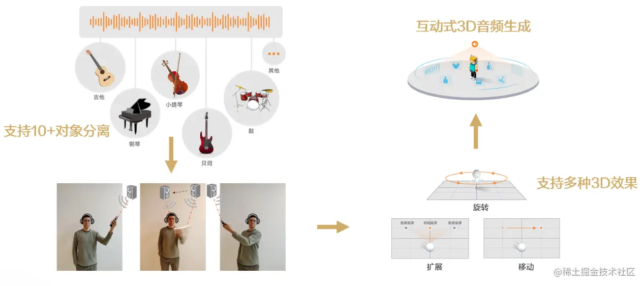 由于我们当前接触到的音频大都是立体声,所有音频对象(如音乐中的人声、钢琴、吉他等)都已经混合在左右两个声道当中,无法轻易地分开,更不要提将其渲染放置在不同的空间位置,因此将立体声中的特定元素分离是3D化的一个核心技术。