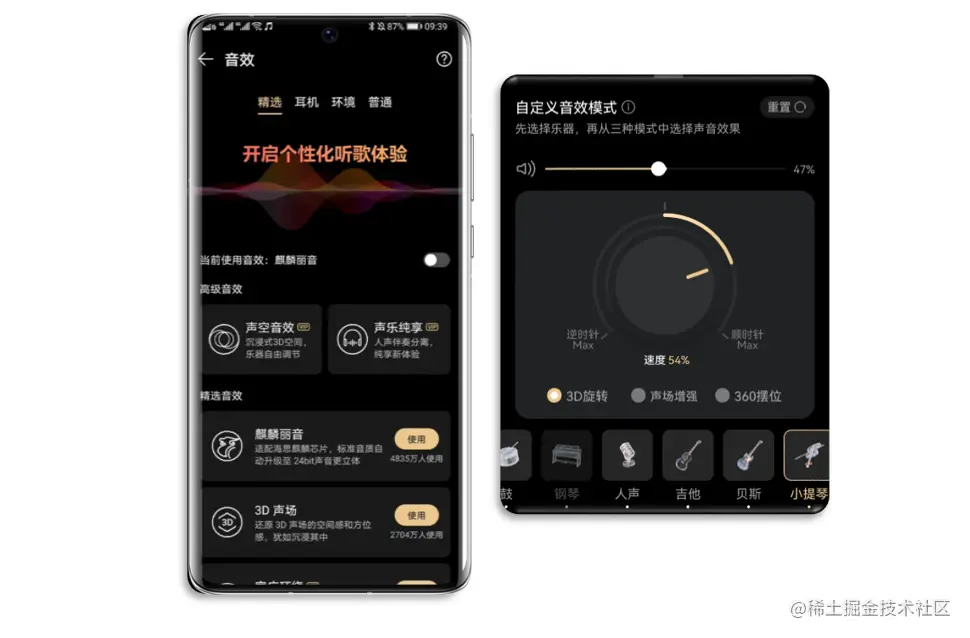目前,HMS Core音频编辑服务提供的音源分离、空间音频渲染服务这套组合拳已经应用在华为音乐的高级音效当中,用户可以进入华为音乐音效页面,在高级音效栏目中选择声空音效或声乐纯享,感受3D音频的魅力。