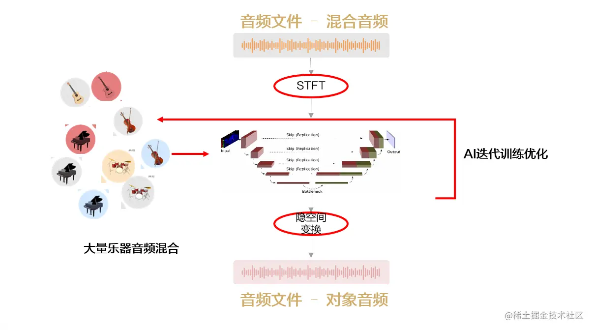 华为算法团队通过对大量的音乐进行深度学习建模,并结合传统信号处理能力最终实现音源分离:首先利用短时傅里叶变换(STFT)将一维的音频信号变换到二维的时频谱;然后将得到的二维的时频谱与原始的一维时域信号一起作为双流输入,通过多层的残差编码及大量数据的训练,获得目标乐器的隐空间表达;最后进一步通过一系列的变换矩阵最终还原成原始的对象立体声信号。 上述处理过程中使用的变换矩阵和网络结构是华为的独特技术,是针对不同的乐器音色特点专门设计的,能够确保每一个乐器都能尽可能的分离完整且干净,为3D化提供足够优质的分轨素材。其涉及的核心能力包括: