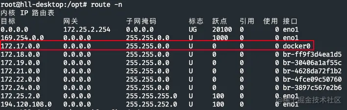后来琢磨可能是docker网桥导致主机路由表异常,定位了一下,果然如此,那么解决方法就很简单了。大概解释一下,docker安装以后会在主机上创建一个虚拟网卡-docker0,而我们启动的容器host网络以外,其他的都是通过docker0这个虚拟网卡经过物理网卡与外部通信的。这个虚拟网卡本身会有一个网段,一般是172.17.x.x,所以问题就明确了,因为docker0占用了这个网段,导致主机无法访问真是的网段机器。只要把docker0绑定的网段修改一下,就可以了。解决步骤如下: