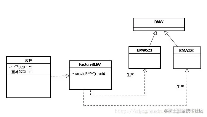 (3)工厂方法模式:为了满足客户,宝马车系列越来越多,如320i、523i等等系列,一个工厂无法创建所有的宝马系列,于是又单独分出来多个具体的工厂,每个具体工厂创建一种系列,即具体工厂类只能创建一个具体产品。但是宝马工厂还是个抽象,你需要指定某个具体的工厂才能生产车出来。