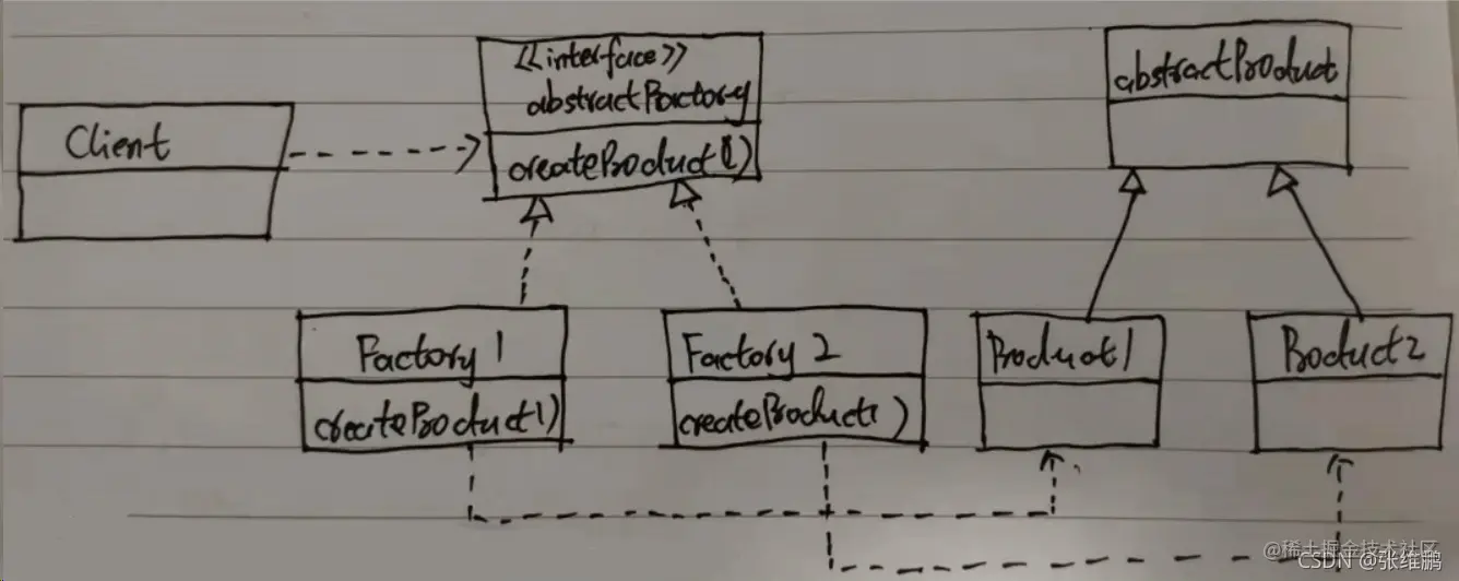 - 抽象产品 AbstractProduct:是具体产品继承的父类或实现的接口,在 Java 中一般有抽象类或者接口来实现。