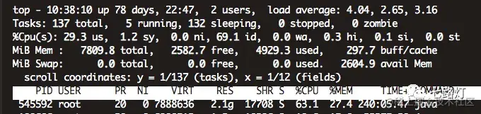 - 服务器内存8G,java进程最大分配内存4G。但进程显示内存使用率27.4,实际使用2.1G。进程内存并没有达到最大分配内存,而CPU却使用率很高。初步分析肯定是Full GC导致CPU使用率高。