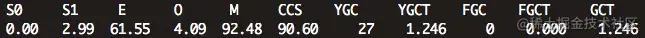 S0:幸存区1当前使用比例 S1:幸存区2当前使用比例 E:伊甸园区使用比例 O:老年代使用比例 M:元数据区使用比例 CCS:压缩使用比例 YGC:年轻代垃圾回收次数 FGC:老年代垃圾回收次数 FGCT:老年代垃圾回收消耗时间 GCT:垃圾回收消耗总时