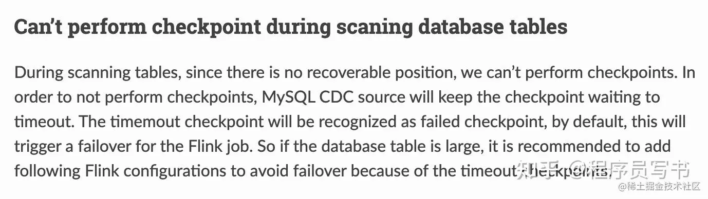 flink默认checkpoint时间间隔10分钟1次,当我们的mysql表数据量比较大,同步时间超过了10分钟时,task则会失败,触发task的failover重启,前面也介绍过了,flink cdc 1.x不支持断点续传,所以,task重启会造成不停获取锁,造成业务系统无法使用。