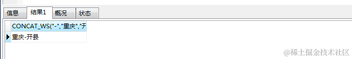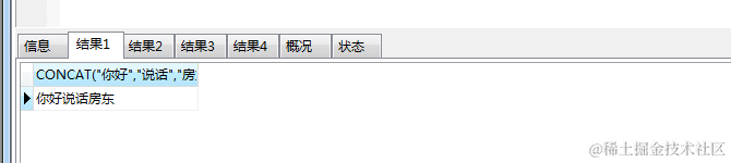 mysql 拼接语法 CONCAT&CONCAT_WS用法 码奴生来只知道前进 2022-07-29 166 阅读1分钟 1:mysql里面的CONCAT语法是拼接字符串 SELECT CONCAT("你好","说话","房东"); 拼接的字符个数不限 拼接效果如下 2 mysql里面的CONCAT_WS语法是拼接字符串 中间以上门字符间隔 SELECT CONCAT_WS("-","重庆","开县"); 拼接的字符可以添加自己的间隔符 3 生成随机数 SELECT SUBSTR(RAND(),3,6);