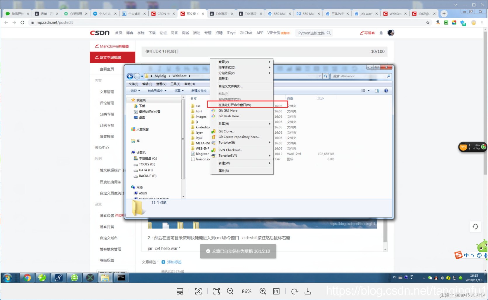 使用JDK 打包项目 码奴生来只知道前进 2022-07-29 24 阅读1分钟 1:首先需要进入到项目文件夹WebRoot目录下 2:然后在当前目录使用快捷键进入到cmd命令窗口 ctrl+shift按住然后鼠标右键 进入到cmd命令窗口之后 直接复制 jar -cvf hello.war * 就执行打包啦