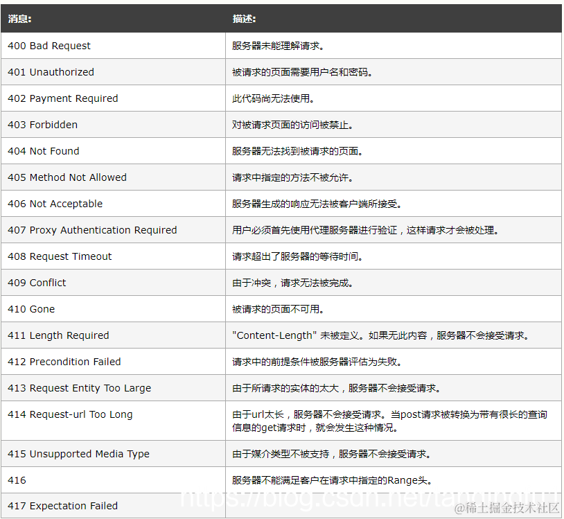 HTTP 请求服务返回的状态码 码奴生来只知道前进 2022-07-29 52 阅读1分钟 当浏览器从 web 服务器请求服务时,可能会发生错误。从而有可能会返回下面的一系列状态消息: 1xx: 信息 2xx:信息 3xx:信息 4xx:信息 5xx:信息