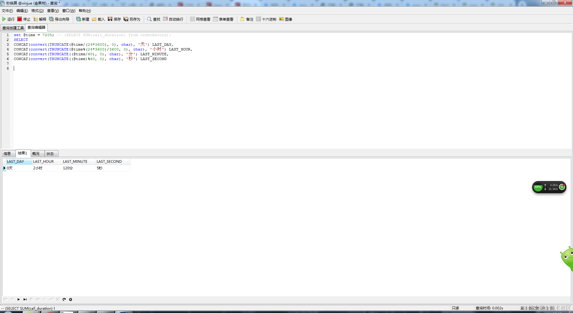 CONCAT(convert(TRUNCATE((@time)%60, 0), char), '秒') LAST_SECOND