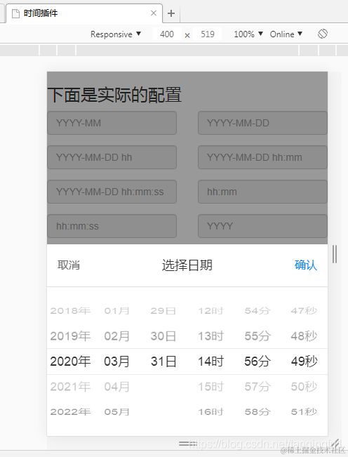 | lang | 否 | 年、月、日... | 配置插件语言,默认:title:'选择日期',cancel:'取消',confirm:'确认', year:'年',month:'月',day:'日',hour:'时',min:'分',sec:'秒' |