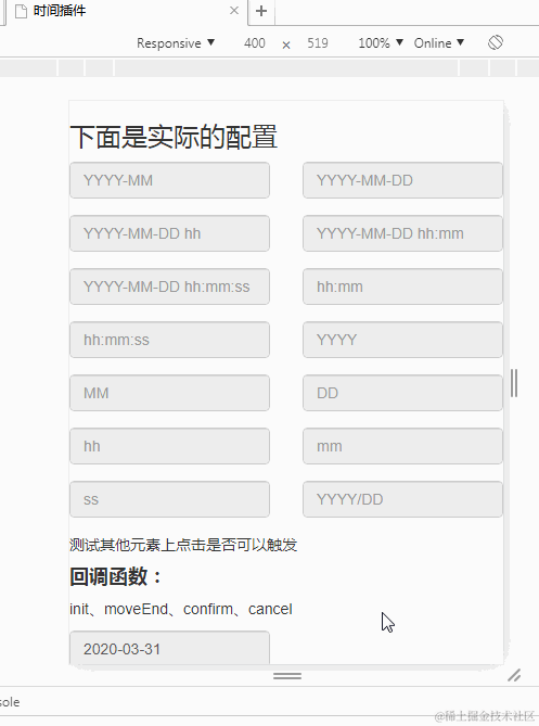 | format | 否 | 'YYYY-MM-DD' | 日期格式,无限制。规则:年-YYYY 月-MM 日-DD 时-hh 分-mm 秒-ss 使用/、-、空格、:之一分隔,可随意组合 |