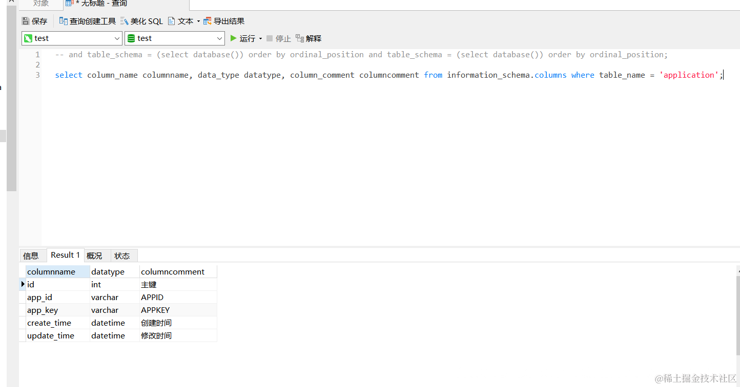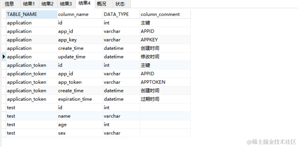 select column_name columnname, data_type datatype, column_comment columncomment from information_schema.columns where table_name = 'application';